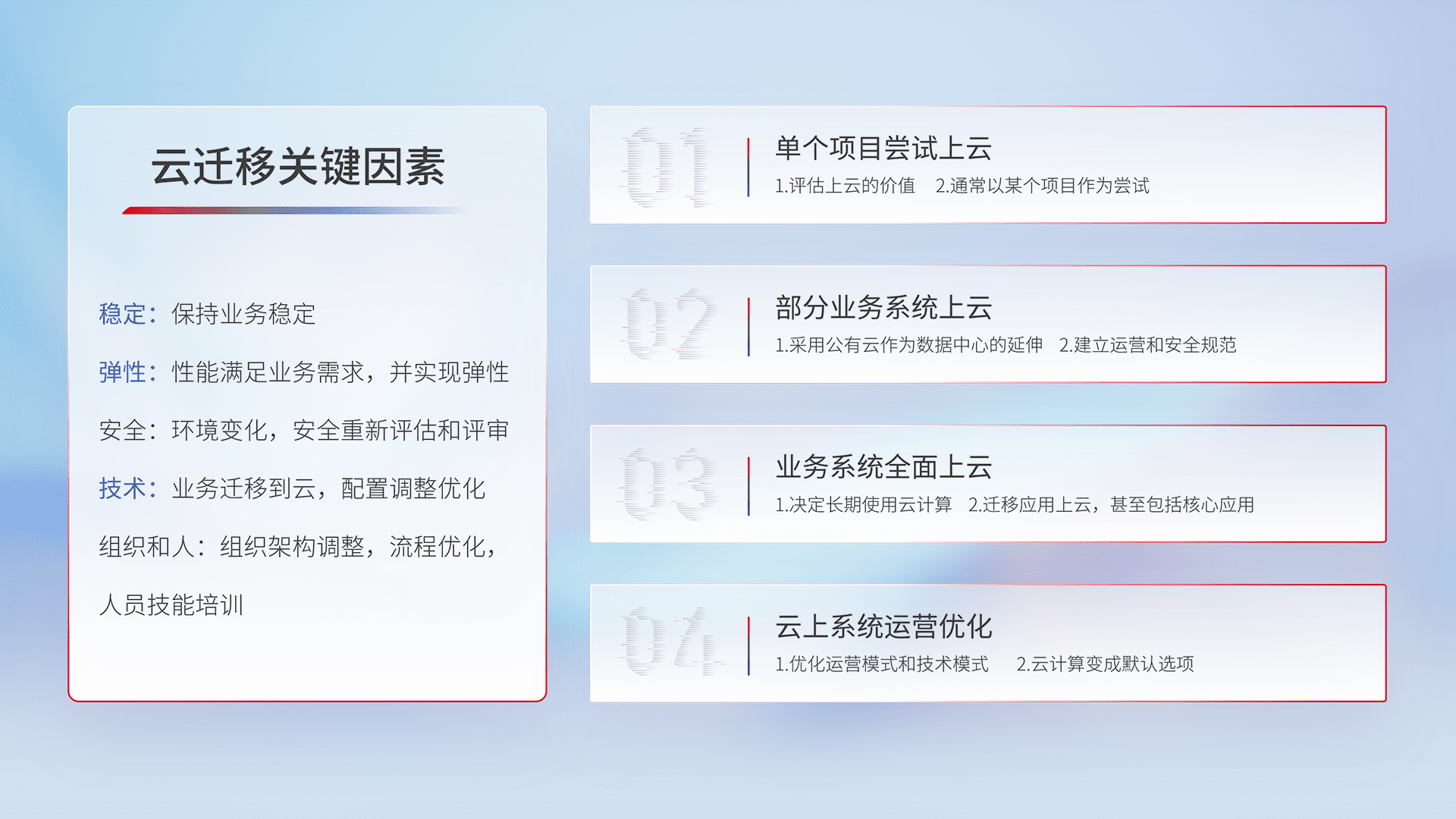 结合实际业务,,,,从规划设计、、、云平台选型、、、云原生改造、、、数据迁移、、、集成交付,,,迁移全过程为客户识别最佳上云路径,,,,做好风险识别管理,,设计网络架构、、、身份权限、、、安全审计合规、、、、操作审计、、、、日志审计、、、监控告警策略、、、、多站点容灾设计等,,,,对云上基础设施进行整体规划,,,提升IT治理水平,,,以满足弹性、、高可用、、、、高性能的需求。。。。