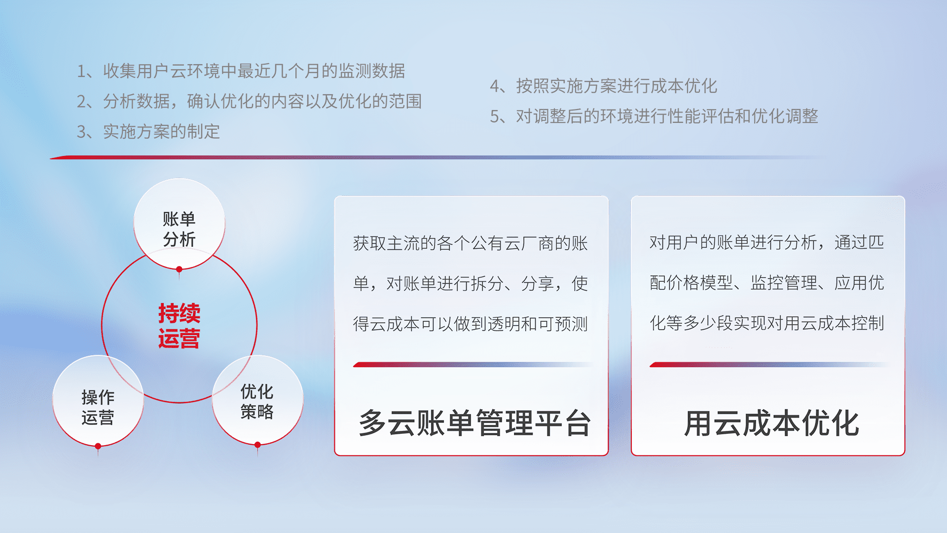 通过多云纳管,,以统一的资源数据模型把客户的云资源进行抽象和封装,,,进而实现对多云资源的统一操作,,保障云资源管理的可靠性、、、、稳定性与可用性。。量身定制化运维内容,,,,配置、、、、开发运维、、补丁管理、、、备份、、监控、、认证和访问管理、、、、审计和日常巡检等,,,,保障在用云过程中的可靠度,,,稳定度以及高可用率。。。